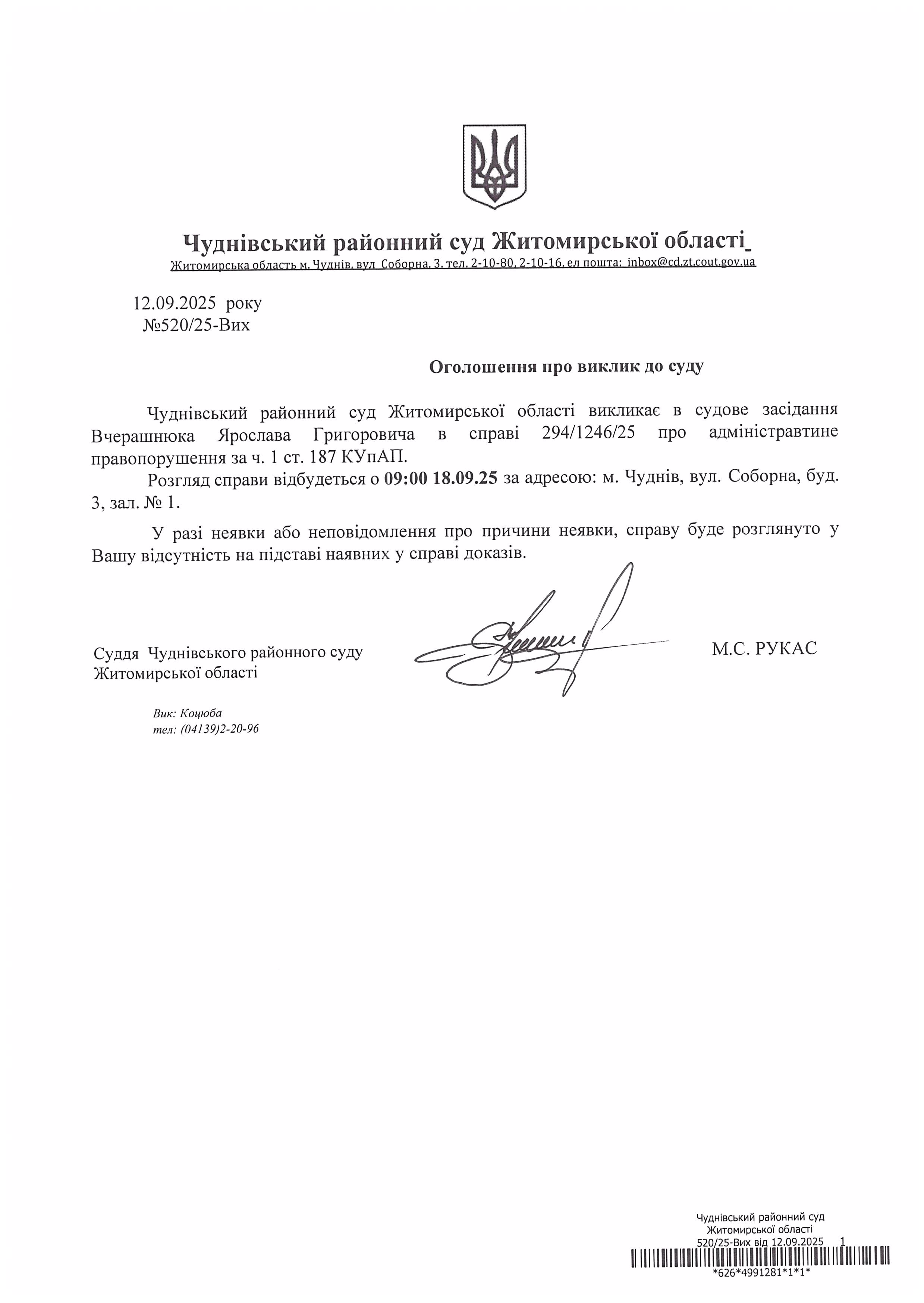 оголошення про виклик до суду Вчерашнюка Я.Г.