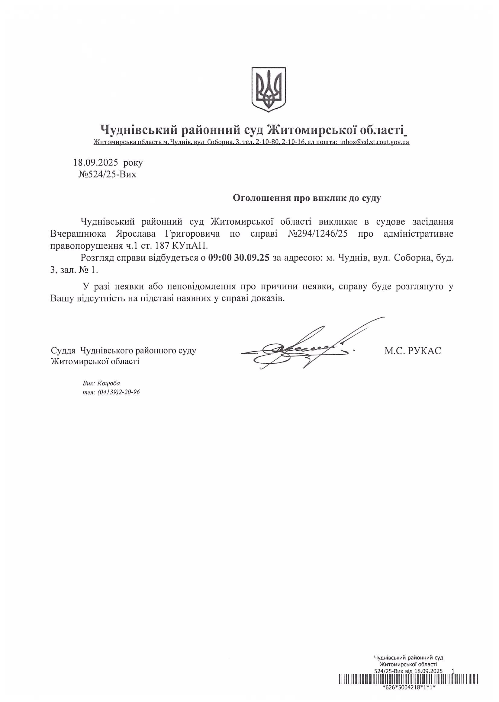оголошення про виклик до суду Вчерашнюка Я.Г.